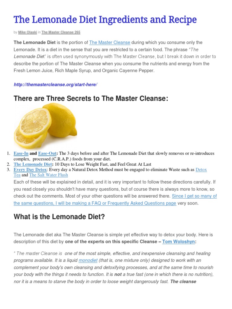 ZuPOOs natural ingredients help rid the body of toxins resetting your gut and digestion. On the last two days of the lemonade fast drink organic apple juice alternating with the lemonade to soften gall stones. Master cleanse diet instructions pdf When the Queen speaks the Bey Hive listens even when it comes to dietary advice.